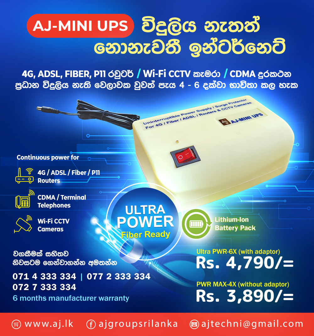 * AJ-MUPS Ultra PWR-6X මාදිලිය වැඩි බලයක් අවශ්ය කරන Fiber B310 වැනි රවුටර් සඳහා පැය 4-5 අතර කාලයක් භාවිතාකල හැකිය.